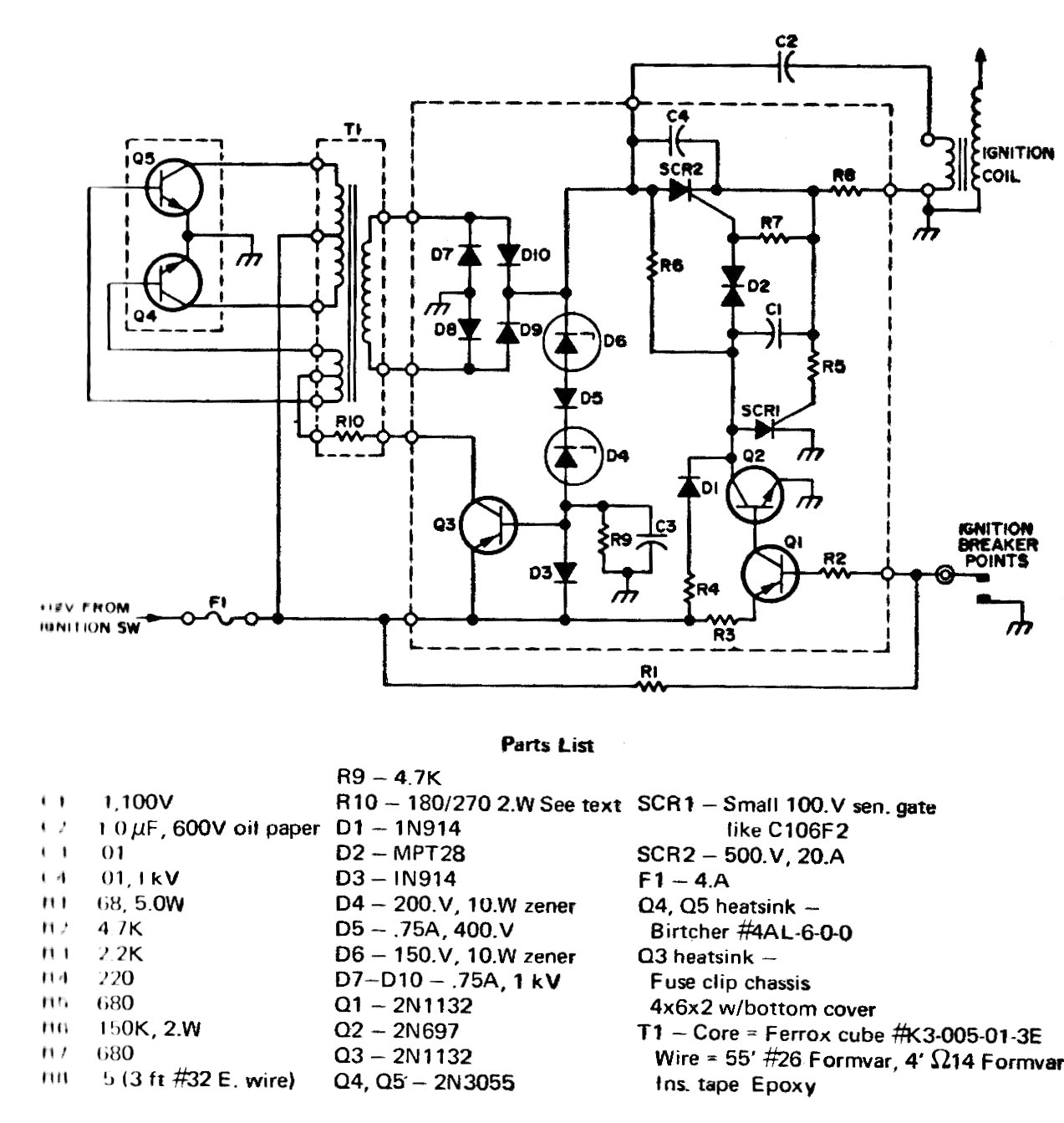 El componente crítico de este circuito de 1975 es el transformador del sector inversor de tensión. Los demás componentes son de la época, pudiendo ser probados equivalentes. El circuito vale más como referencia para un proyecto más moderno.