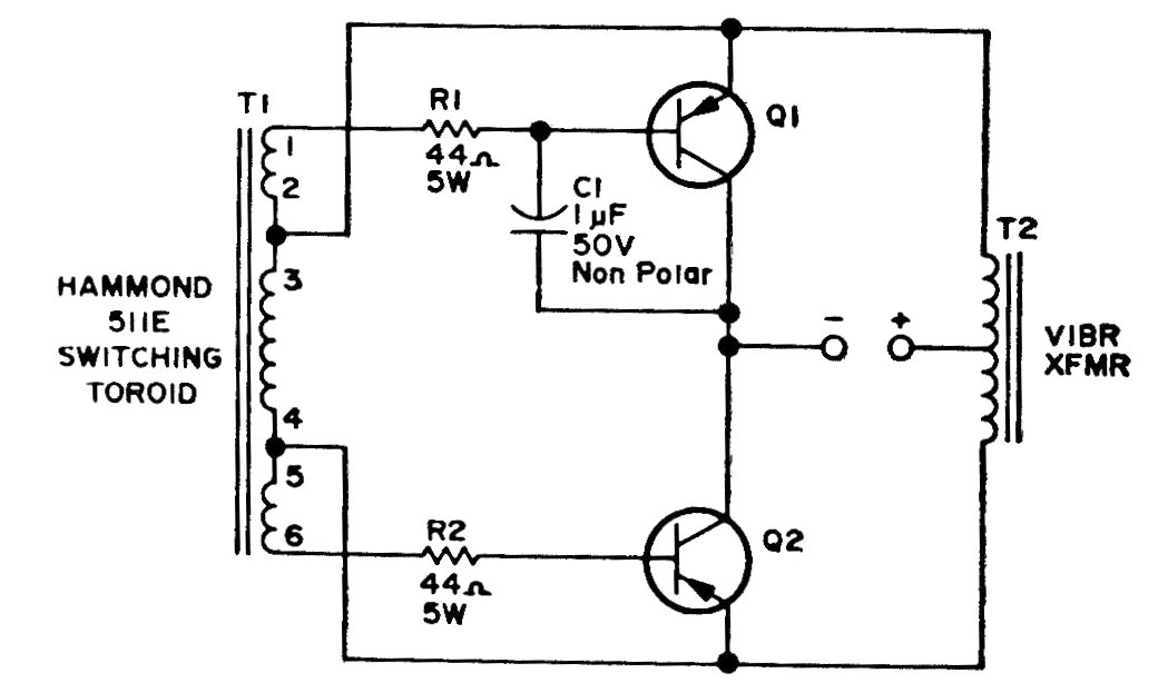 Este circuito de 1975, para aplicaciones automotrices sustituye al vibrador mecánico encontrado en los coches antiguos para producción de alta tensión en la alimentación de equipos valvulados. Los transistores admiten equivalentes.