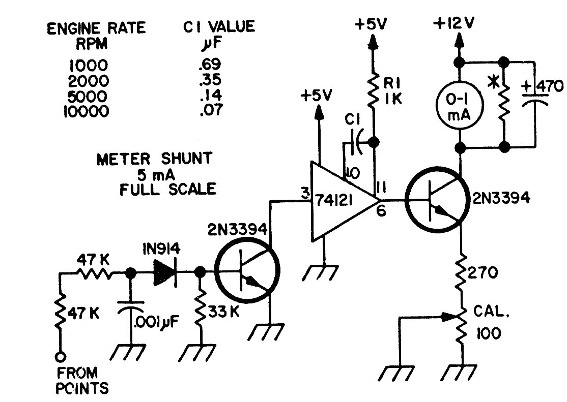 Este tacómetro de 1975, para coches con platinados puede servir de idea para nuevos proyectos. Los componentes son de la época y un amplificador operacional equivalente moderno se puede utilizar. El indicador es analógico.