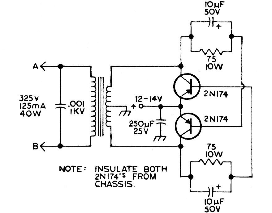 Este circuito, para uso automotriz, fue encontrado en una publicación de 1975. Los transistores son de la época y el transformador debe tener bobinas de acuerdo con la potencia deseada. Para el tipo indicado la potencia es de 40 W con 525 V x 125 mA.