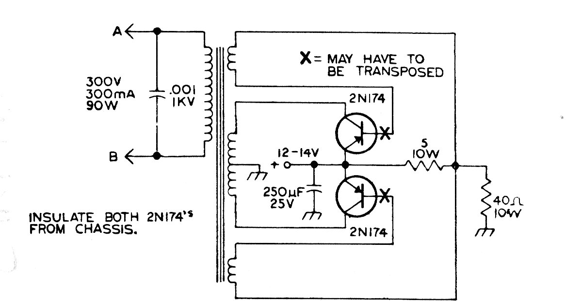 Indicado para uso automotriz en una documentación americana de 1975, este circuito utiliza componentes de la época. El transformador es componente crítico determinando las características del circuito. Los transistores deben estar dotados de buenos disipadores de calor.