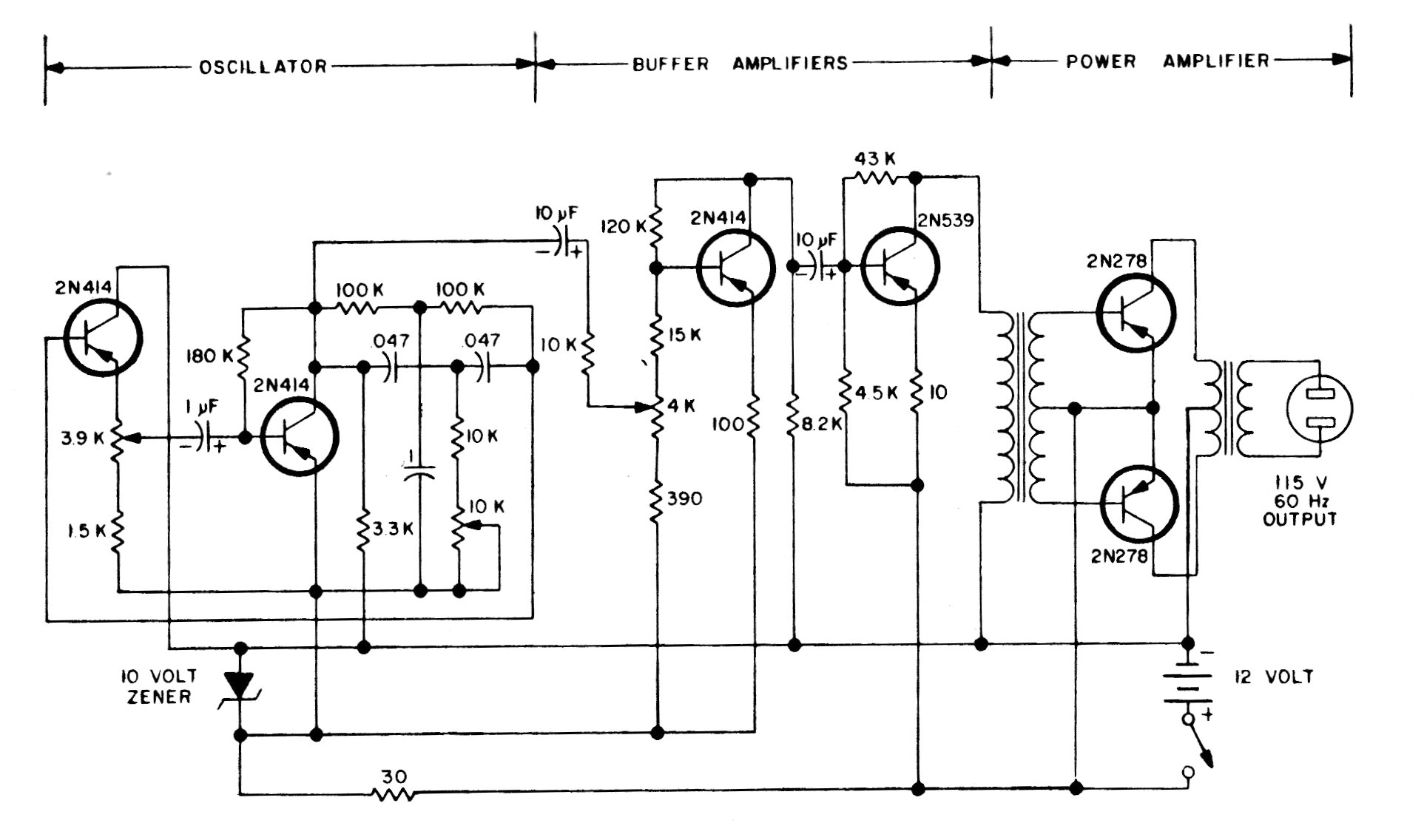 Este sofisticado circuito es de una documentación de 1975. Los componentes son de la época y también son componentes críticos en el diseño de los transformadores. El circuito opera con una corriente de al menos 12 A de entrada en batería de 12 V, descontando su rendimiento.