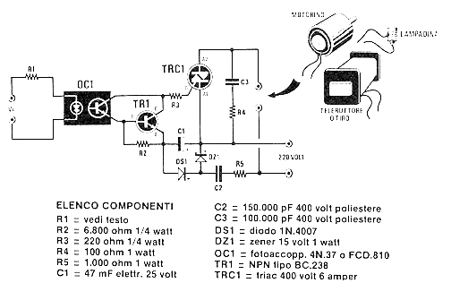 Este circuito de shield salió en una Nuova Elettronica de febrero de 1986. La revista ya no existe, pero el circuito da una idea de cómo podemos usar un acoplador con un transistor para accionar un motor, lámpara o solenoide de 24 VAC. TR1 es un BC548 (equivalente al BC238) y los diodos son 1N4007. La corriente máxima de la carga depende del Triac que puede ser cualquiera de la serie TIC, con disipador de calor. OC1 puede ser cualquier acoplador con foto-transistor interno.