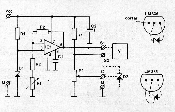 Este circuito fue encontrado en una revista Resistor, de la España de septiembre de 1986 y aún actual, a no ser por los circuitos sensores. La lectura de temperatura se puede realizar en un voltímetro o en un multímetro común. El circuito sensor se puede obtener en tres versiones LM135, LM235 y LM335 con diferentes franjas de cobertura. Compruebe en el datasheet cuál debe ser utilizado para su aplicación. El amplificador operacional puede ser el 741 y D1 es un diodo zener de 2,73 V. El circuito es alimentado por una tensión de 15 V y el ajuste de escala se realiza en P1 y P2.