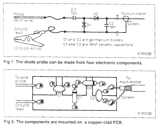 La revista de donde sacamos este diagrama es una rareza. Se trata de la revista D-i-Y Radio de Mayo-Junio de 1994, una revista inglesa vendida sólo por firma, tratando de montajes electrónicos. El circuito simple mostrado es una punta de prueba que permite a un multímetro común detectar señales de RF y evaluar su intensidad. En las figuras tenemos el diagrama y la disposición de los componentes en una pequeña placa de circuito impreso.