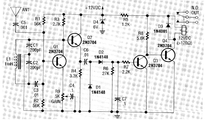 Este circuito fue encontrado en una revista Hands On de 1986. La revista ya no existe, pero el circuito es viable aún en nuestros días. Se trata de un sensor de tacto, donde el sensor es antena de metal. El circuito acciona un relé de 12 V x 100 mA (o menos) y los transistores pueden los BC548. Con alimentación de 6 V el relé puede ser de 6 V y el circuito también funcionará. Nunca alimente este circuito con fuente sin transformador.