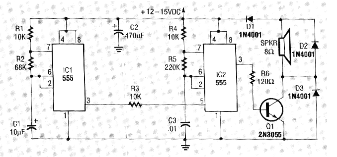 Este circuito fue encontrado en una revista Hands On de 1986. La revista ya no existe, pero el circuito es viable aún en nuestros días. Se trata de una sirena de dos tonos con el conocido 555 y el 2N3055 transistor de potencia en la salida. Se trata de una configuración encontrada en casi todas las publicaciones que abordan el funcionamiento del 55. En los mismos en artículos del sitio tenemos este circuito. El circuito puede ser alimentado con tensiones de 9 a 12 V y tiene excelente potencia de salida. R1, R2 y R3 se pueden cambiar para modificar los efectos.