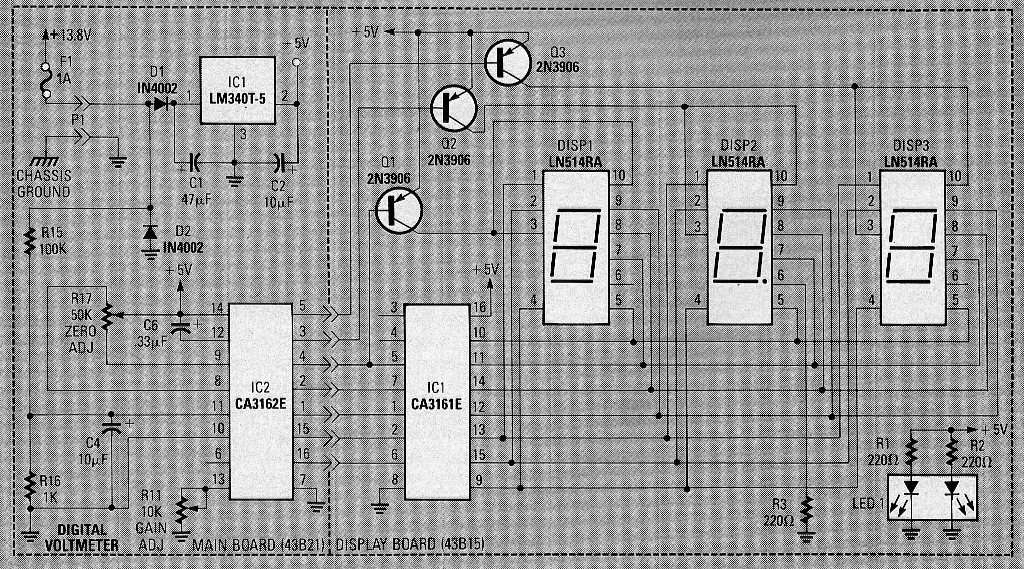 Este circuito fue encontrado en una revista Hands On de 1986. La revista ya no existe pero el circuito es viable aún en nuestros días. Se trata de un monitor digital de 3 tipos que indica constantemente la tensión de una batería de 12 V. se basa en un par de integrados que además de poco comunes son caros, pero si el lector los encuentra. Los transistores admite equivalentes como los BC558. El circuito puede ser adaptado para funcionar como un voltímetro digital también.