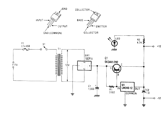 Este circuito fue encontrado en una revista Hands On de 1986. Se trata de una fuente que permite alimentar aparatos automotores de hasta algunas decenas de vatios en la bancada. El circuito es por lo tanto una fuente de alimentación de prueba, simple de montar. El transistor puede ser sustituido por un 2N2955 y el transformador debe tener 12 V con al menos 2,5 A. El puente de diodos se puede sustituir por 4 1N5404. El transistor y el circuito integrado deben montarse en buenos radiadores de calor.