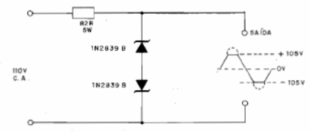 Este circuito corta los picos por encima de 105 V manteniendo una tensión máxima de 105 V pico a pico en la carga alimentada. La corriente máxima es 120 mA. Los Zeners con otros valores de tensión pueden ser usados, con los debidos cambios de valor del resistor.