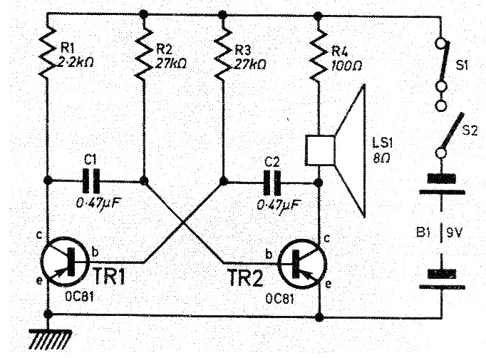 Este circuito fue encontrado en una revista de 1976. El circuito emite un sonido cuando un sensor de balance colocado en una vara de pescar y accionado por el movimiento causado por el pescado atrapado. El circuito es alimentado por pilas y el altavoz es de baja impedancia.