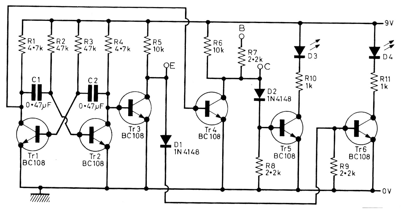 Este interesante circuito fue encontrado en una revista de 1977. La revista ya no existe, pero el circuito puede ser montado con transistores BC548 en lugar de los originales. La indicación de NPN y PNP viene dada por dos LED. La alimentación se puede realizar por batería o fuente de 9 V.