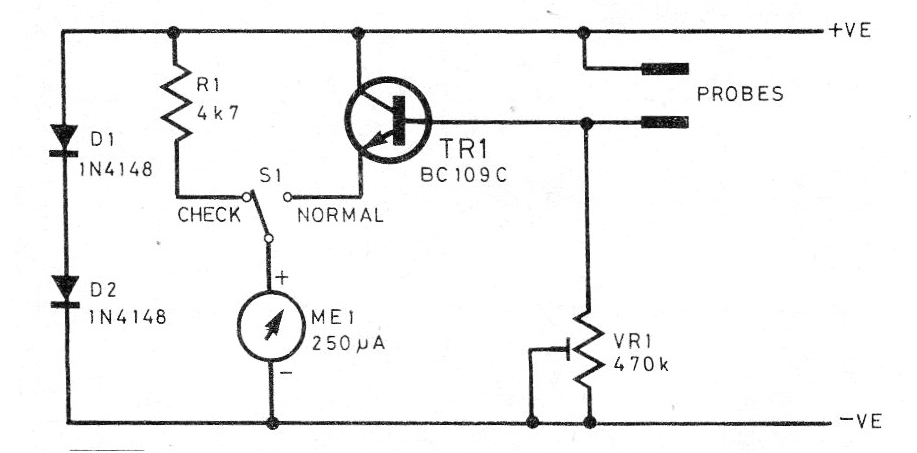Hemos encontrado este circuito en una revista inglesa de 1983, pero se puede montar fácilmente con el transistor BC548 o BC549 en lugar del original. El circuito indica el grado de conducción entre los sensores, que depende de la humedad de un vaso, de un jardín u otro lugar supervisado. Se puede utilizar una celda solar de calculadora.