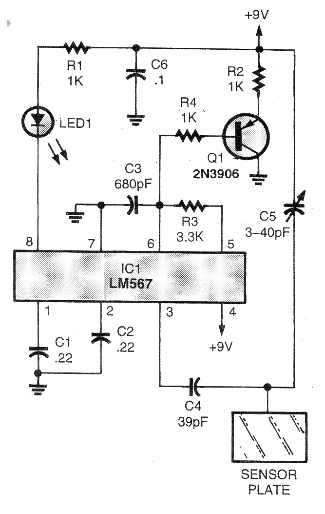Este circuito se obtuvo en un Poptronics de 2001. La revista ya no existe en su forma impresa, pero el circuito puede ser montado con facilidad. En lugar del transistor original se puede utilizar el BC548. Se trata de una llave o relé de tacto que activa un LED, pero en lugar del LED se puede utilizar un relé sensible.