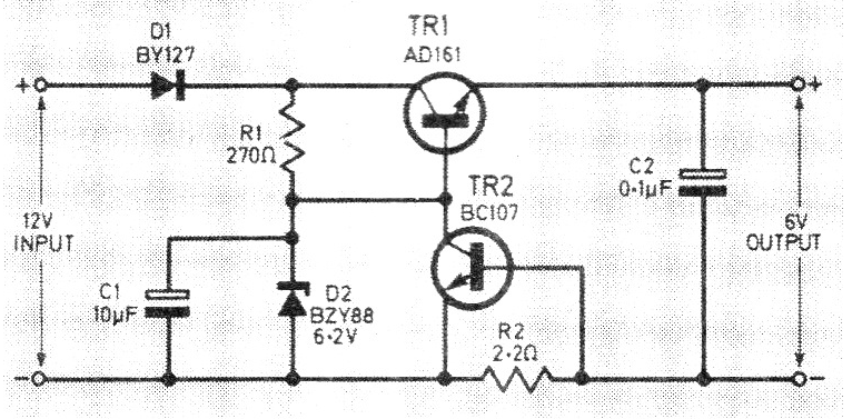 Este circuito es de una revista inglesa de 1976. Los componentes son comunes pudiendo ser usados el TIP41 paraTR1 y BC548 para TR2. La entrada es el secundario de un transformador de 12 V x 2 A; D1 puede ser un 1N5402. No se deben alimentar radios o tocadiscos con potencias superiores a 15 W.