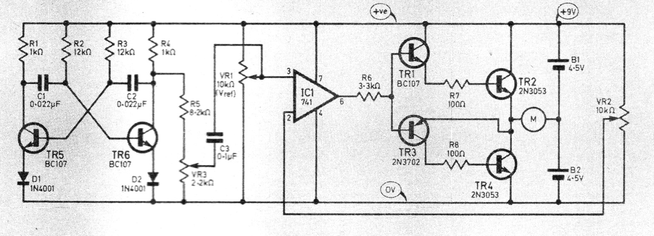 Este circuito es de una revista inglesa de 1976. Los componentes son comunes pudiendo los transistores ser sustituidos por equivalentes más modernos. Para TR5, TR6 y TR1 podemos usar los BC548. Para TR3 podemos usar el BC558. Los transistores TR2 y TR4 pueden ser los BD135. La alimentación debe ser de acuerdo con el motor, entre 6 y 12 V.