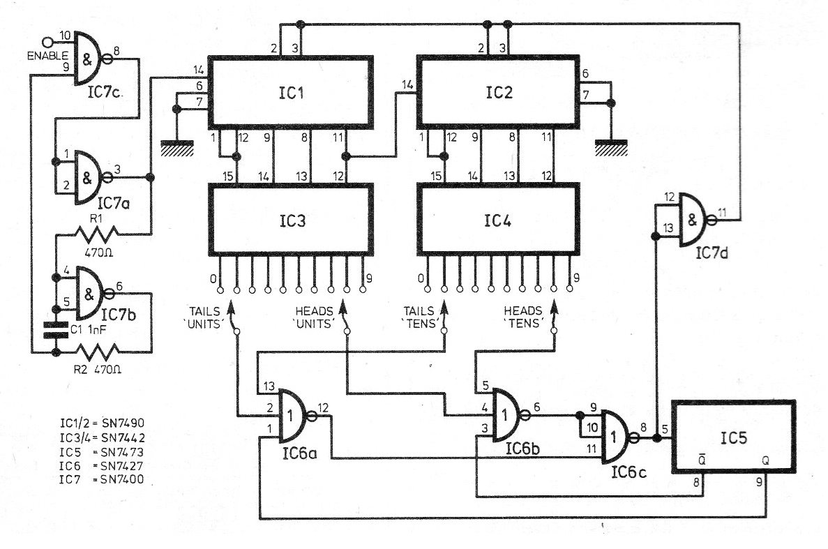 Este circuito es de una revista inglesa de 1976. Los componentes son comunes y la alimentación debe ser fea con 5 V ya que se trata de circuito TTL. Las llaves seleccionan las probabilidades de salir las faces en el sorteo.