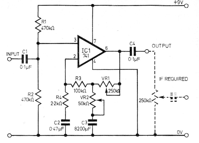 Este circuito fue encontrado en una revista inglesa de 1977. Las entradas y salidas de señales deben ser blindadas y el circuito puede ser alimentado por batería, ya que su consumo es bajo.