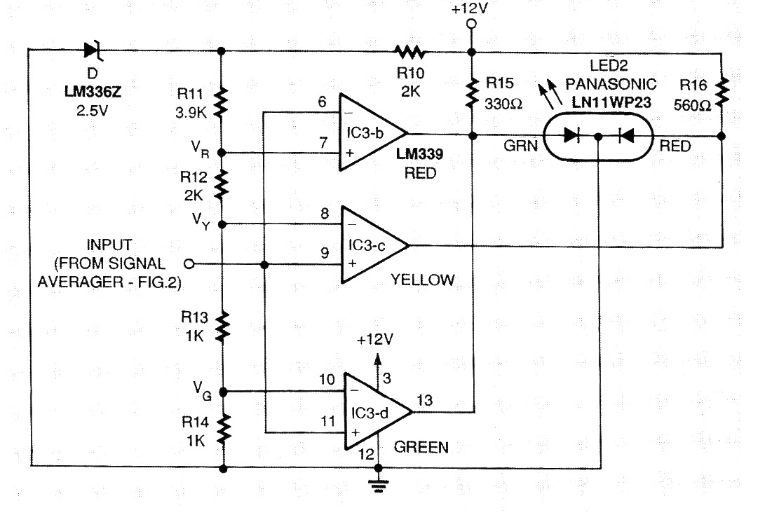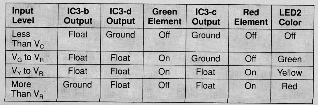 Este circuito se obtuvo en un Electronics Now de enero de 1988. La revista ya no existe, pero el circuito se puede montar fácilmente con un LED bicolor común o dos LED. En la tabla, las indicaciones obtenidas con el circuito.