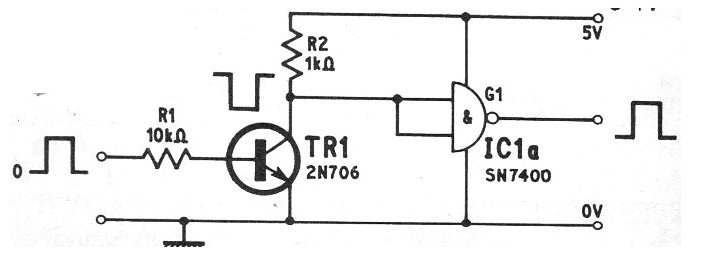El circuito mostrado fue obtenido en una revista de 1973, pero puede ser montado fácilmente con el uso de BC548 como transistores. Lo que este circuito hace es excitar una entrada TTL a partir de señales no TTL. El circuito debe ser alimentado por fuente de 5 V.