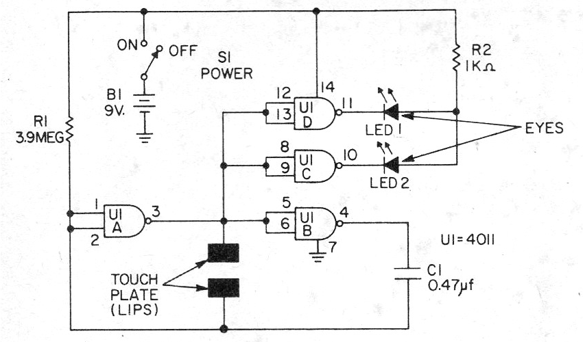 Este circuito fue encontrado en una Elementary Electronics de 1980, pudiendo ser montado aún hoy, pues los componentes usados todavía son comunes. El circuito hace que dos LED parpadeen cuando tocamos en dos placas sensoras. Puede ser alimentado por pilas o batería con tensión de 6 a 9 V. En el original consiste en una alegoría en forma de cara donde los ojos (eyes) son los LED que parpadean cuando los labios (lips) son tocados.