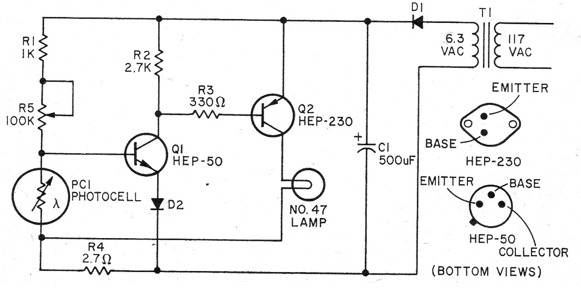 Este circuito se obtuvo en una Elementary Electronics de 1974. El circuito funciona mejor con transistores de germanio originales pero puede ser montado con BC548 para Q1 y BD136 para Q2, operando con lámparas hasta 100 mA. El circuito hace que la lámpara se encienda cuando la luz que incide sobre el LDR disminuye. El punto de accionamiento se ajusta en R5. El transformador tiene 200 mA o más, según la lámpara y D1 es un 1N4002.