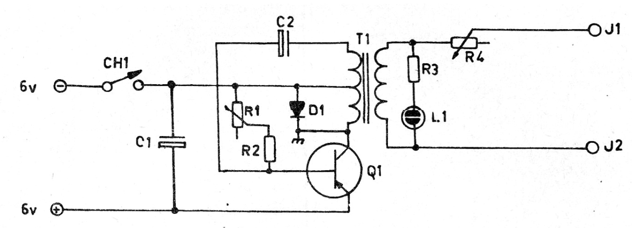 Este circuito es de una antigua revista Radio TV Técnico de la década de los 70, hecha por mi amigo A. Fanzeres, ya fallecido en la época en que recuperé el texto (2011). El artículo describe un pequeño inversor que se puede utilizar para excitar nervios y producir pequeños estímulos o choques. El transistor puede ser el BD135 y lo transforma puede ser de 110 V x 6 + 6 V con corriente de 50 a 250 mA.