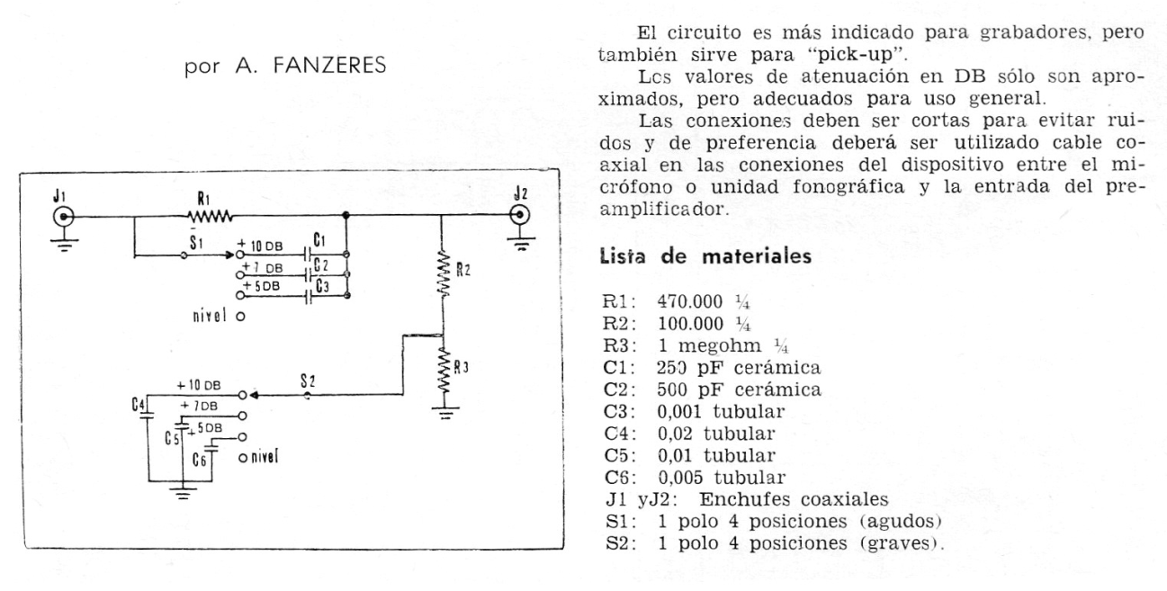 He encontrado este artículo de mi amigo A. Fanzeres en una revista uruguaya Corriente Alterna de julio de1972. El artículo describe un control de tono pasivo que se puede utilizar en la entrada de amplificadores de audio de alta impedancia, principalmente del tipo valvulado.