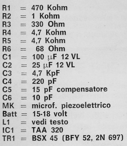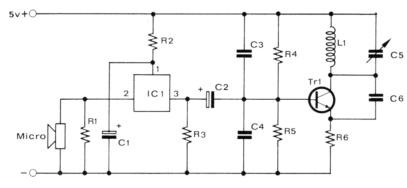 Este circuito fue encontrado en una Radio Elettronica (Italia) de abril de 1974. El circuito se puede montar aún hoy con el transistor 2N2222. Sólo el circuito integrado original es más difícil de obtener. El alcance es del orden de algunas decenas de metros y la bonina consiste en 4 espiras de hilo 26 o 28 con un diámetro de 1 cm sin núcleo. La antena debe tener de 10 a 40 cm si se utiliza y debe conectarse al colector de Q1.