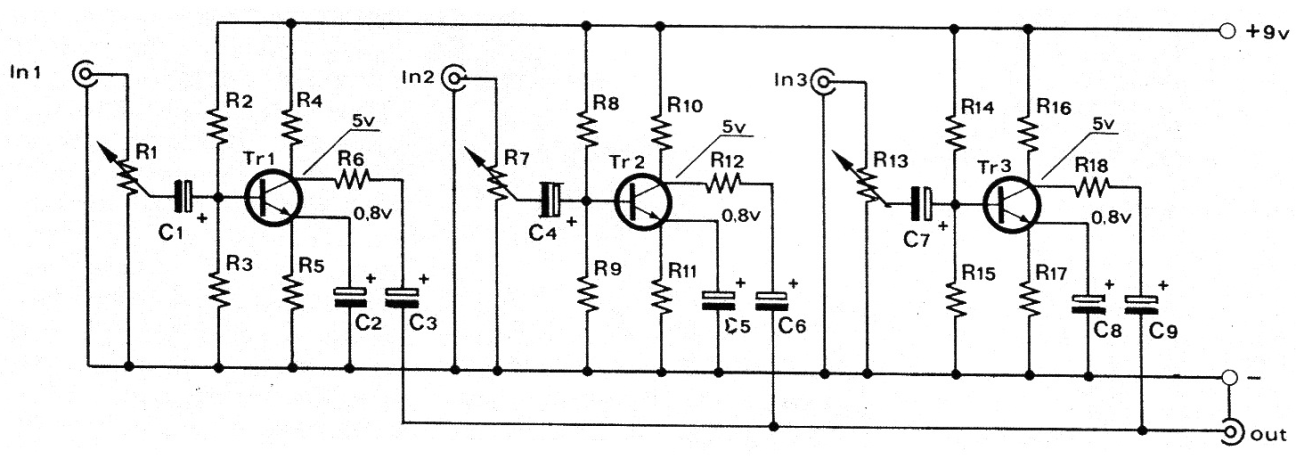 Este circuito fue encontrado en una Radio Elettronica (Italia) de abril de 1974. El transistor se puede montar todavía hoy con los transistores BC549 en lugar de los originales. El número de canales indicado es 3, pero el circuito se puede elaborar con 2 o 4 canales también. La alimentación de bajo consumo puede provenir de fuente o batería. La señal de salida está entre 1 y 10 mV.