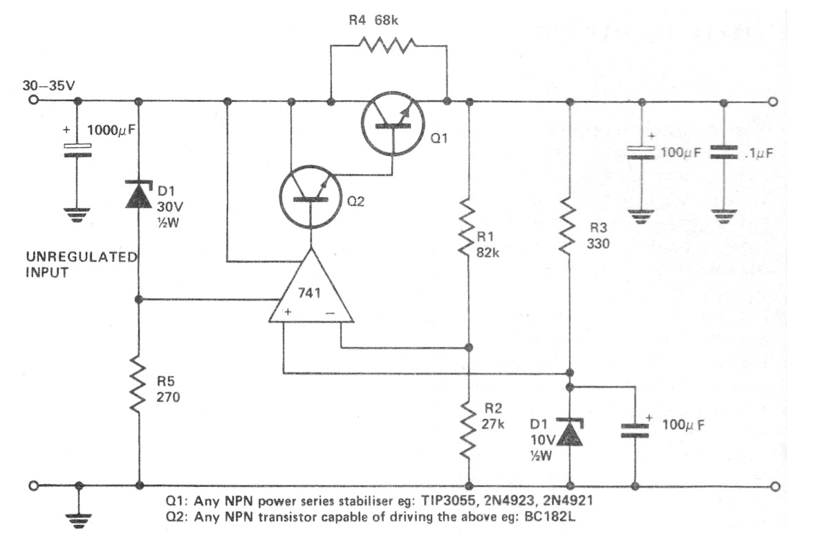 He encontrado este circuito en una revista de diciembre de 1975. El circuito proporciona una corriente de algunos amperios y la tensión es determinada por el zener. R1 y R2 pueden ser reemplazados por un potenciómetro para convertir el circuito en una fuente variable. El transistor Q1 debe montarse en un buen radiador de calor.