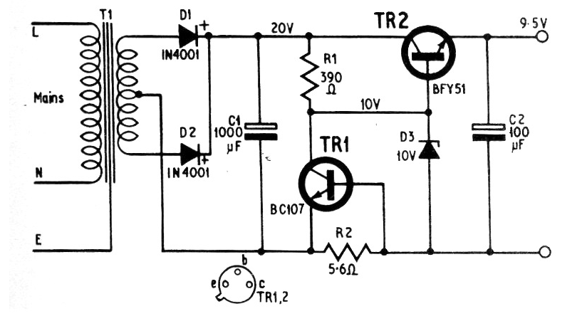 Este circuito fue encontrado en una revista inglesa de 1973. Se sustituye la batería de 9 V en circuitos comunes. TR1 puede ser un BC548, TR2 un BD136 y los diodos 1N4002 o equivalentes. El transformador es de 12 + 12 V con 50 mA o más. El zener es de 400 mW. El circuito tiene protección contra cortocircuito en la salida.