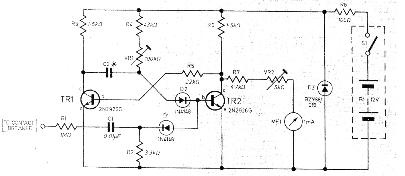 Este circuito fue encontrado en una revista de 1976. El circuito emite un sonido cuando hay una llamada en un teléfono. El circuito puede ser montado con transistores BC548 o 2N222 y el instrumento es del tipo analógico de bobina móvil. El circuito es para los coches antiguos que todavía utilizan platinado en el sistema de encendido.
