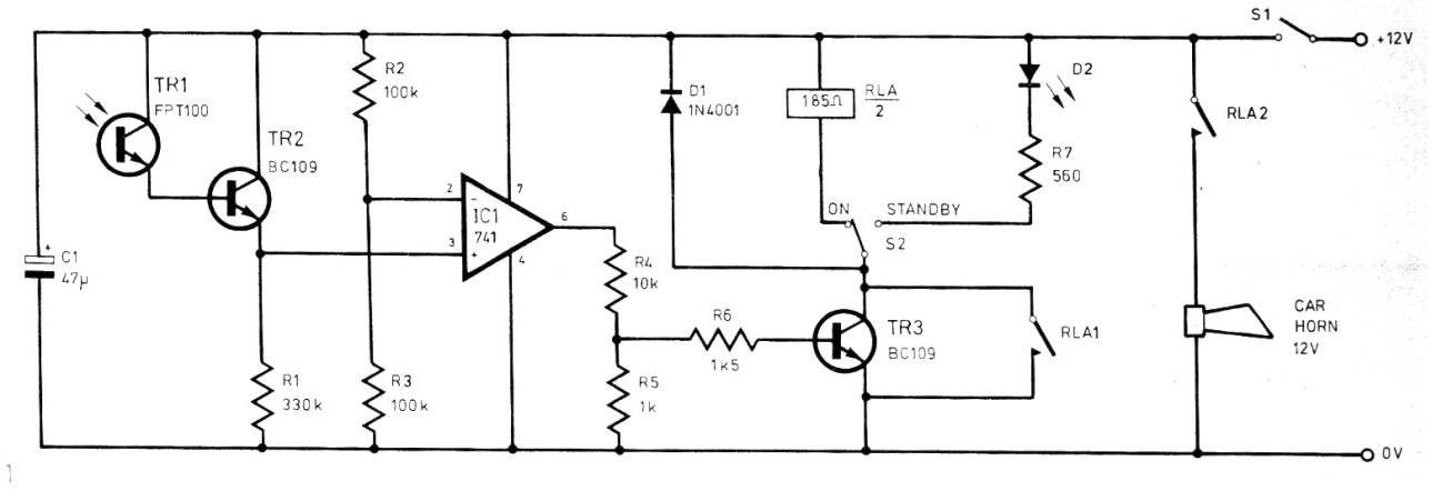 Este circuito fue obtenido en una revista inglesa de 1985. El circuito todavía se puede montar con transistores BC548, disparando un relé sensible de 12 V. El circuito acciona una alarma cuando la luz incide en el foto-transistor (que puede ser de cualquier tipo). La idea básica es ocultar en el maletero de un coche para tener el disparo con la luz que entra en caso de robo.