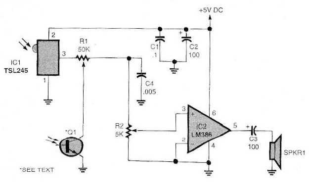 Este circuito se obtuvo en una Popular Electronics de octubre de 1998. La revista ya no existe, pero el circuito se puede montar con facilidad, ya que todos los componentes son comunes excepto el TSL245 que puede ser un poco más difícil de obtener. Este circuito produce un tono que depende del control de la luz que incide en los dos sensores.