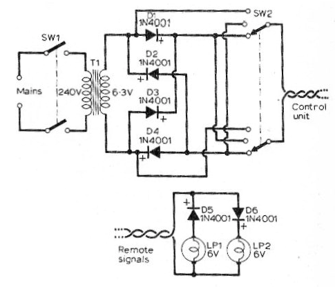 Hemos encontrado este circuito en una revista inglesa de 1973, pero se puede montar fácilmente El circuito se puede utilizar con lámparas de 6 o 12 V, según el transformador y los diodos también pueden ser los 1N4002 o 1N4004.
