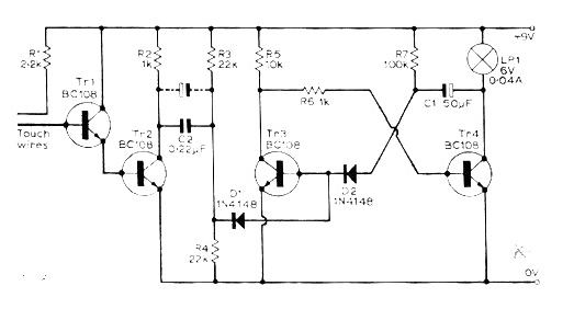 Encontramos este circuito en una revista inglesa de 1973, pero se puede montar con facilidad utilizando los transistores modernos BC548 en sustitución de los originales. Nunca alimente este circuito con fuente sin transformador. La lámpara debe tener hasta 50 mA a 9 V o 12 V.