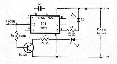 He encontrado este circuito en una revista de 1977. La revista ya no existe, pero el circuito puede ser montado con facilidad, pues todos los componentes utilizados son comunes. El transistor puede ser el BC548. La alimentación de 5 V viene del propio circuito en prueba.