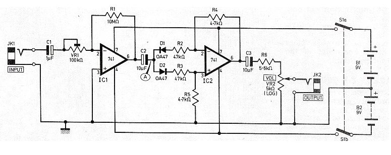 He encontrado este circuito en una revista de 1977. La revista ya no existe, pero el circuito puede ser montado con facilidad, pues todos los componentes utilizados son comunes. La alimentación se realiza por dos baterías de 9 V y el circuito debe ser intercalado entre la salida de la guitarra y la entrada del amplificador.