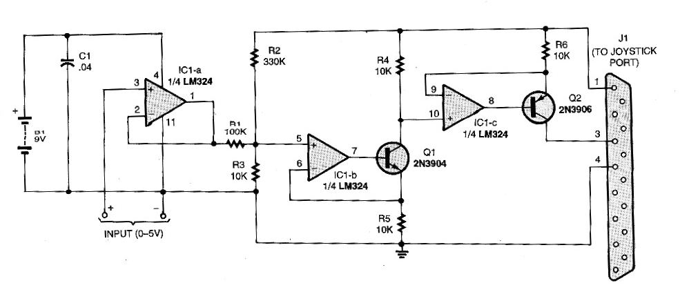 Este circuito se obtuvo en un Poptronics de enero de 2000. Esta revista americana ya no existe, pero el circuito se puede montar fácilmente con los transistores BC548 en lugar de dos originales. El circuito hace uso de la puerta de joystick de un PC antiguo.