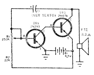 Este circuito fue encontrado en una revista de 1964, que ya no existe. Se trata de un metrónomo, o como llamado en la época "cadencia electrónica". Se puede montar con un BC548 para TR1 y BC558 para TR2. R7 puede ser de 220 k y 470 k. La alimentación se puede realizar con 4,5 o 6 V.