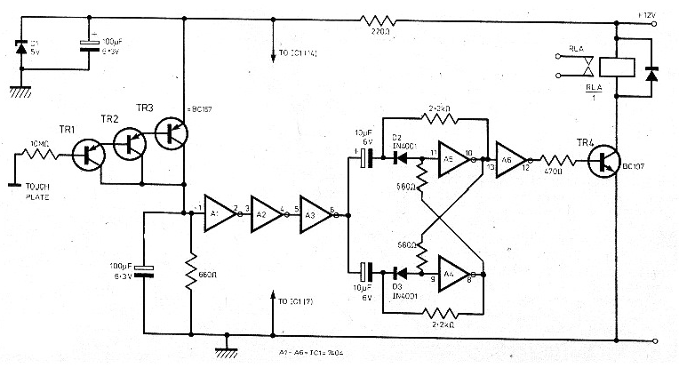 Este circuito fue encontrado en una revista de 1973, pero todavía se puede montar con la utilización de transistores equivalentes modernos como los BC548 para TR1, TR2, TR3 y TR4 El circuito acciona un relé cuando se toca la placa. El circuito es biestable y los inversores son TTL.