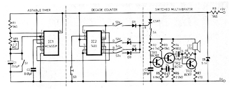 Este circuito fue encontrado en una revista de 1973, pero todavía se puede montar con la utilización de transistores equivalentes modernos como los BC547. El circuito acciona un circuito oscilador de audio en los intervalos ajustados por el potenciómetro. El rango máximo seleccionado por las llaves que colocan diodos del divisor en el circuito llega a 16 minutos con los valores de los componentes indicados. El SCR puede ser el TIC106.