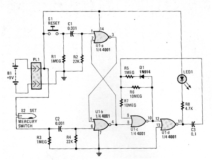He conseguido este circuito en un Hands On Electronics de 1988. La revista americana ya no existe, pero el circuito se puede montar fácilmente. El sensor es una llave de mercurio que se activa cuando el cartero abre y cierra la caja de cartas de una residencia. El circuito puede ser adaptado para otros propósitos.