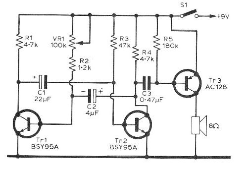 Este mezclador fue publicado en una revista de 1975. El circuito todavía se puede montar, simplemente usando transistores BC548 para los NPN y BD136 para el PNP. La alimentación puede provenir de una batería o una fuente.