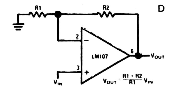Esta configuración tradicional es del manual del LM107, que no es un componente común actualmente. El circuito es de los años 80. El circuito, sin embargo, vale para los operacionales de cualquier tipo.