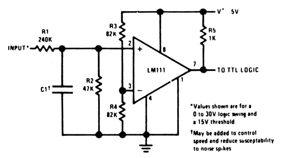 Este circuito es de una documentación antigua haciendo uso de un operacional que no es común en nuestros días. Sin embargo, la configuración puede adaptarse para funcionar con los operacionales modernos. La alimentación debe ser de 5 V.