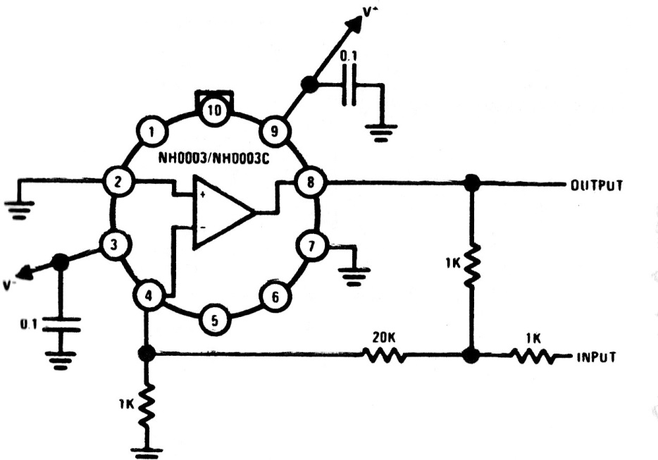 Este amplificador de respuesta rápida utiliza un integrado que no es común en nuestros días, pero se puede implementar con los equivalentes modernos. El circuito es de una documentación de fábrica de los años 80.