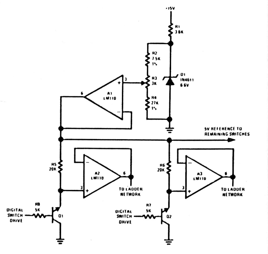Este circuito es un controlador para red R-2R de convertidores AD. Encontramos en una documentación de fábrica de los años 80. La configuración se puede adaptar a la plataforma se utiliza con los operacionales modernos.
