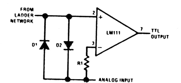 Esta configuración de amplificador con el LM111 utiliza diodos de corte (Clamp) para mejorar la respuesta. La configuración puede ser usada con operacionales equivalentes más modernos, ya que está en un manual de los años 80.